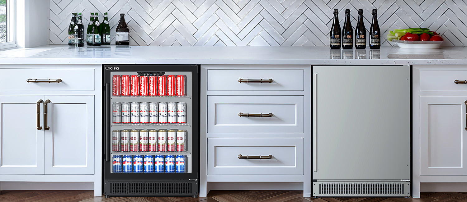 Coolski 24” 180 Cans(12 Oz.) Under Counter Built-In / Freestanding Beverage Refrigerator with Glass Door