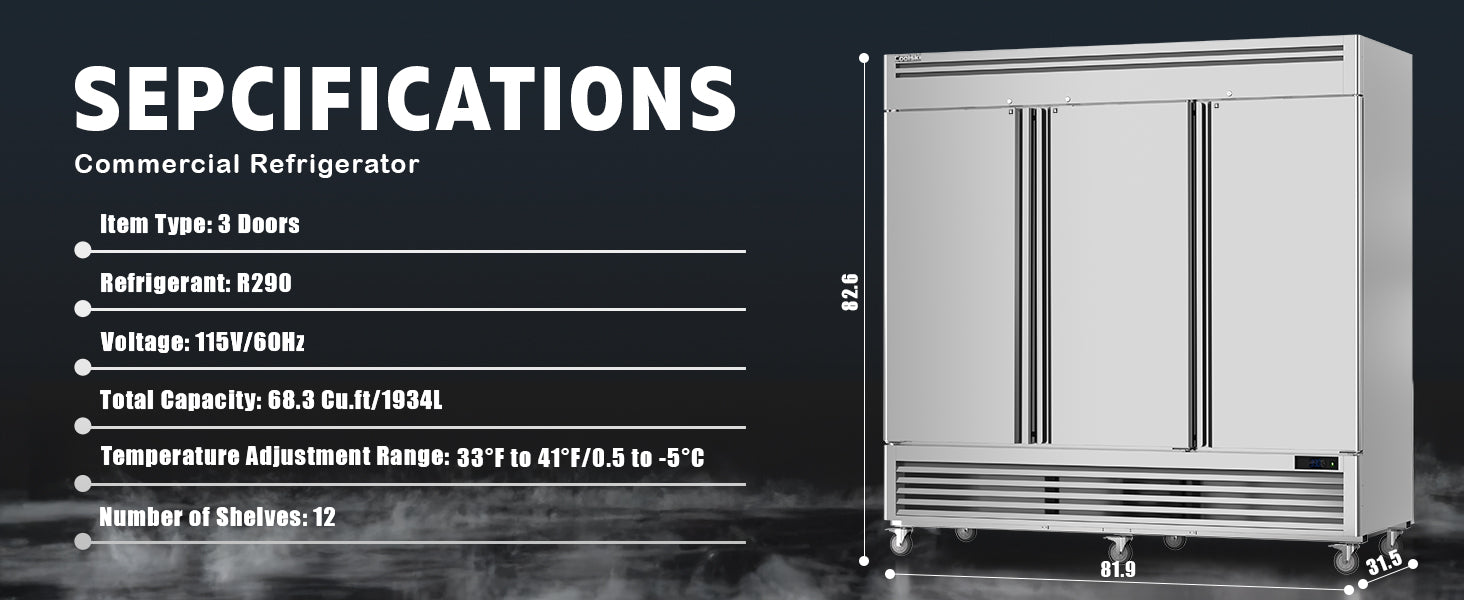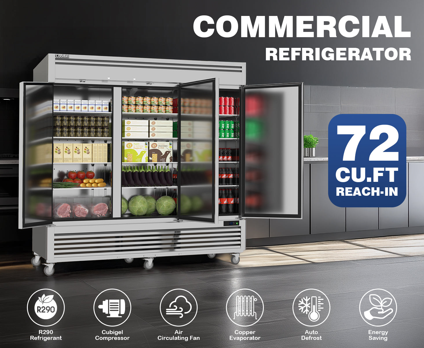 Coolski 82" W Commercial Refrigerator, 72 Cu.ft Three Solid Door Stainless Steel Reach-in Refrigerator