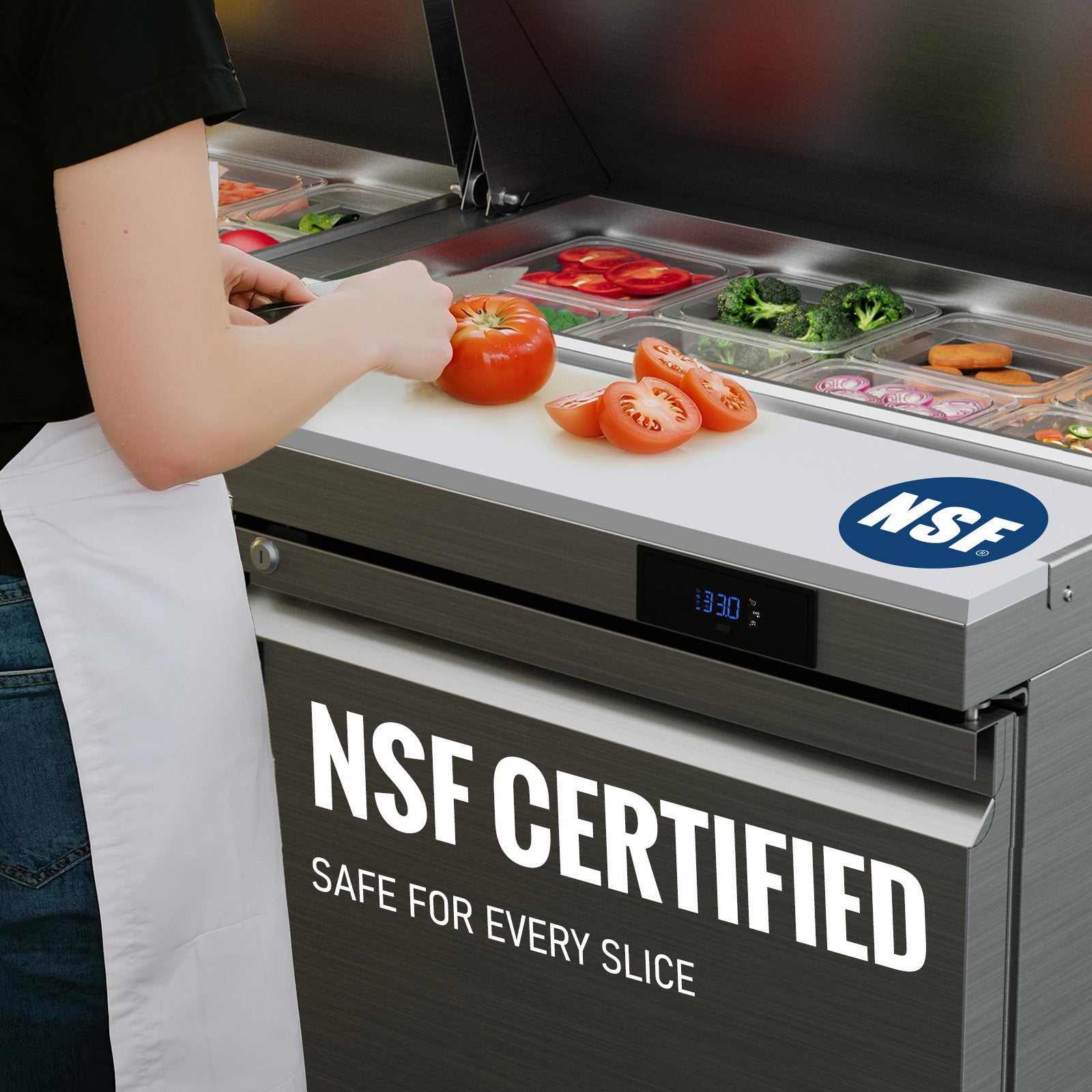 - Multiple Security: The 1/2 inch thick cutting board holds NSF certification, ensuring food safety. With DOE and ETL certifications, plus an integrated compact design, it’s safer and easier to use. Backed by Coolake’s quality, it also includes 5 years of compressor and 3 years of parts. Safe for your food, safe for everyday use and perfectly suited for cafeterias and delis.