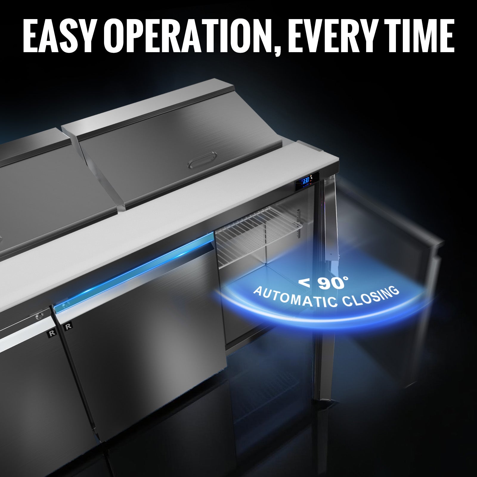 - Reliable Preservation Combination: Our commercial refrigerator sandwich salad prep table features a superb compressor, R290 refrigerant, and 4 fans enabling fast, even cooling. Polyurethane foam-lined cabinets lock in temperature to keep them steady, while tight door gaskets prevent cold air loss. Automatic defrost system maintains refrigeration efficiency. These robust components keeping your food safely preserved.