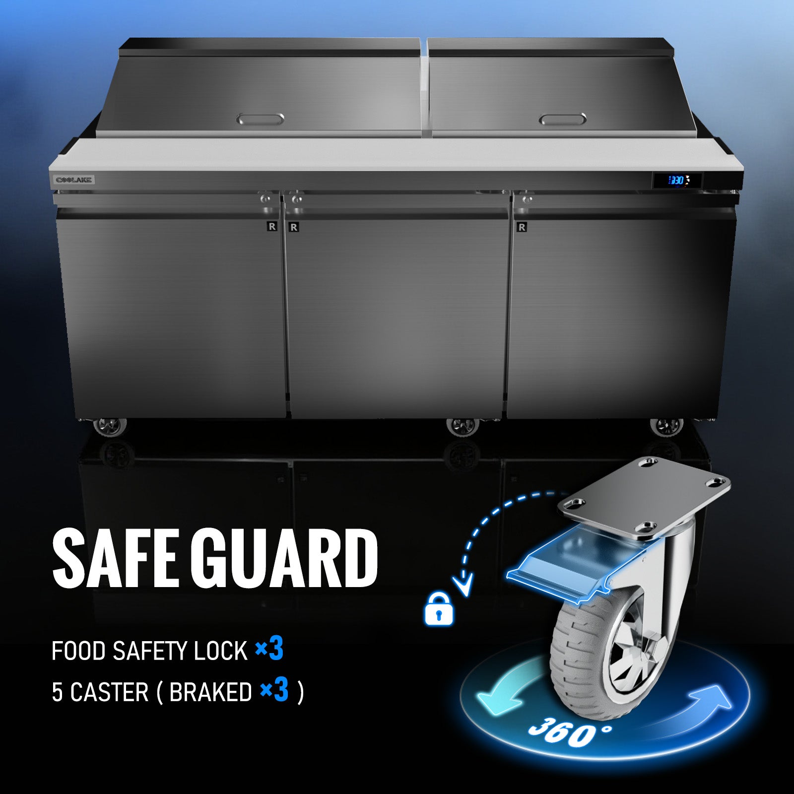 Coolake 72.7'' W 3 Door Commercial Refrigerator Sandwich Salad Prep Table, Stainless Steel 22 Cu.ft Counter Fan Cooling Refrigerator with 18 GN 1/6 Pans