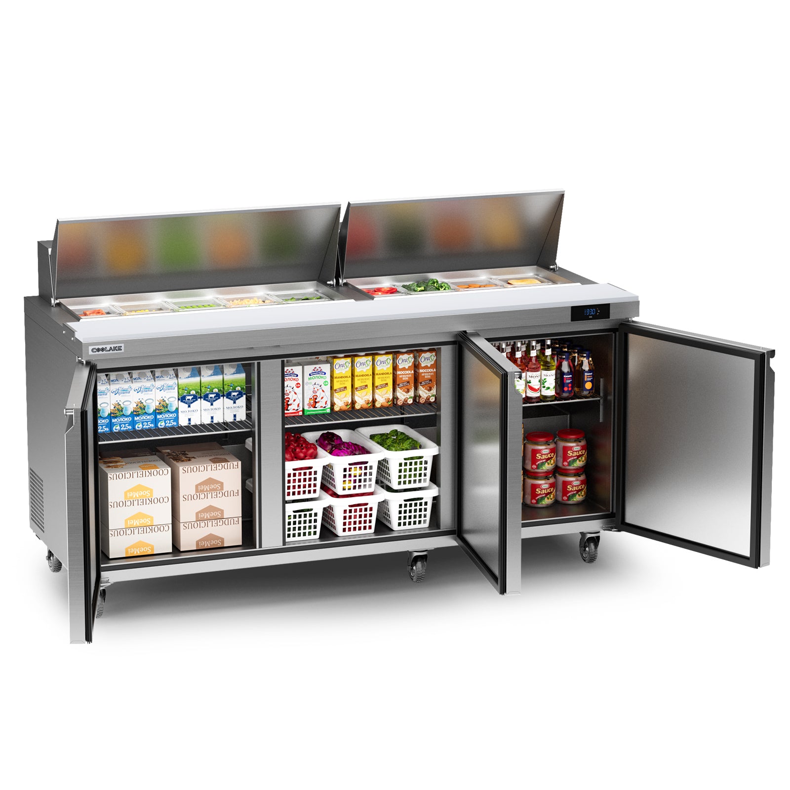 - Customizable Organization Options: This 3 door sandwich salad prep table's cold topping area comes with a full set of adjustable stainless steel clip-on dividers and 18 food pans, let you mix and match for a custom layout, craft your unique workflow. Refrigeration compartment boasting a 22 cuft capacity accommodates all your oganize backup ingredients.