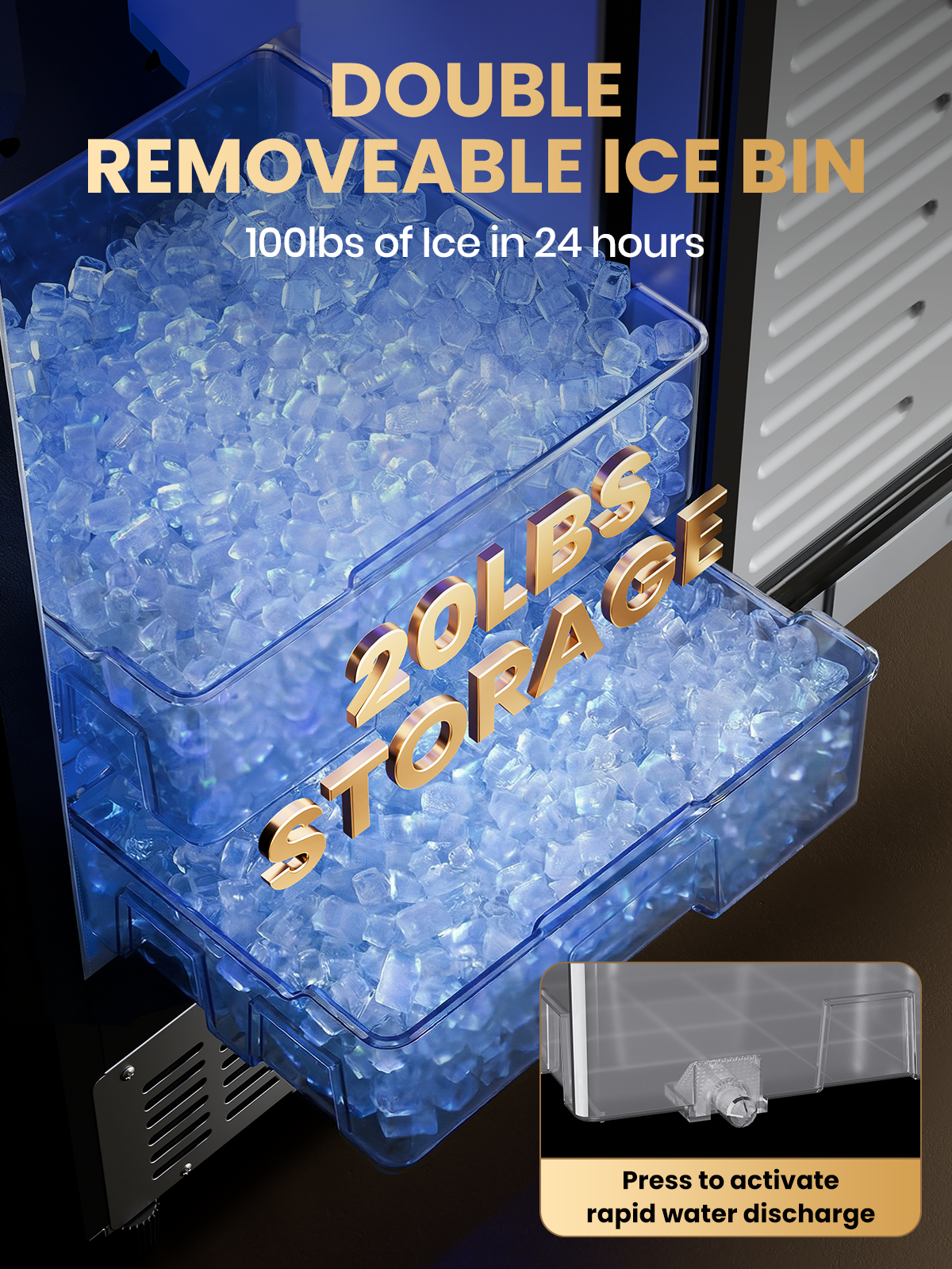 - REVOLUTIONARY DUAL LAYER STORAGE:Our undercounter ice maker features a unique double-drawer design with two independent ice baskets. With a massive 20lbs total storage capacity (10lbs per basket), you can serve one batch while the other continues to harvest, never running out during parties.