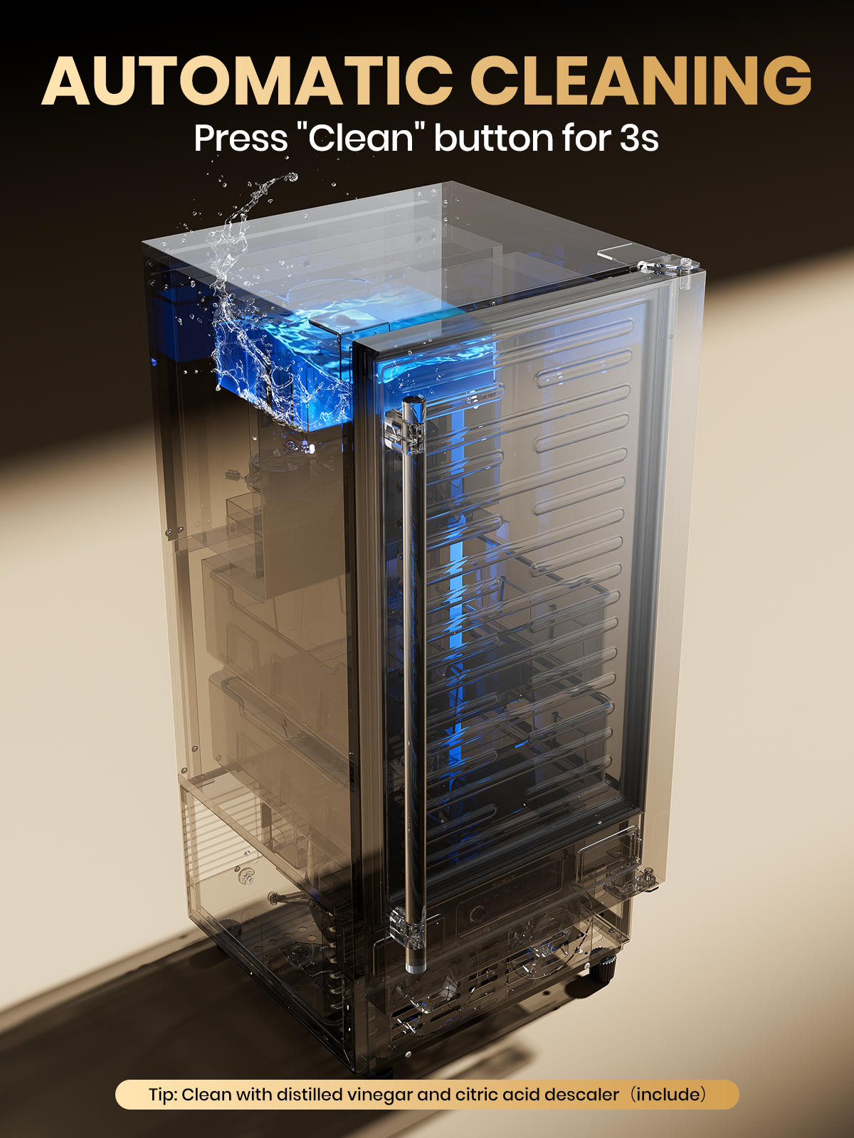 - SMART MONITORING &SELF CLEANING:Take full control with the intuitive LCD panel. Features include a timer for scheduled ice production, "Ice Full" and "Add Water" infrared sensors. The built-in LED light provides clear visibility inside the storage bin, while the dedicated scoop holder and one-touch self-cleaning function ensure the highest standards of hygiene and convenience.