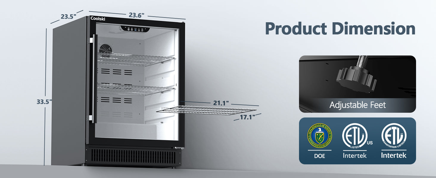 【Elegant Glass Door Design】Coolski beverage fridge features 2 layers of tempered glass door that stabilizes temperature levels against harmful rays and keeps glass from fogging, protects your beverage to the greatest extent and keeps the interior clearly visible at all times. And this fridge has been certified ETL, ETL SANITATION (NSF Standard 7), and DOE, providing you with huge benefits whether in safety or cost.