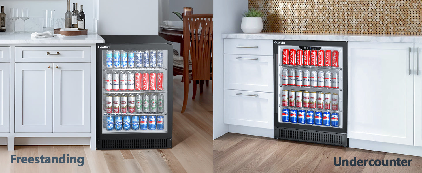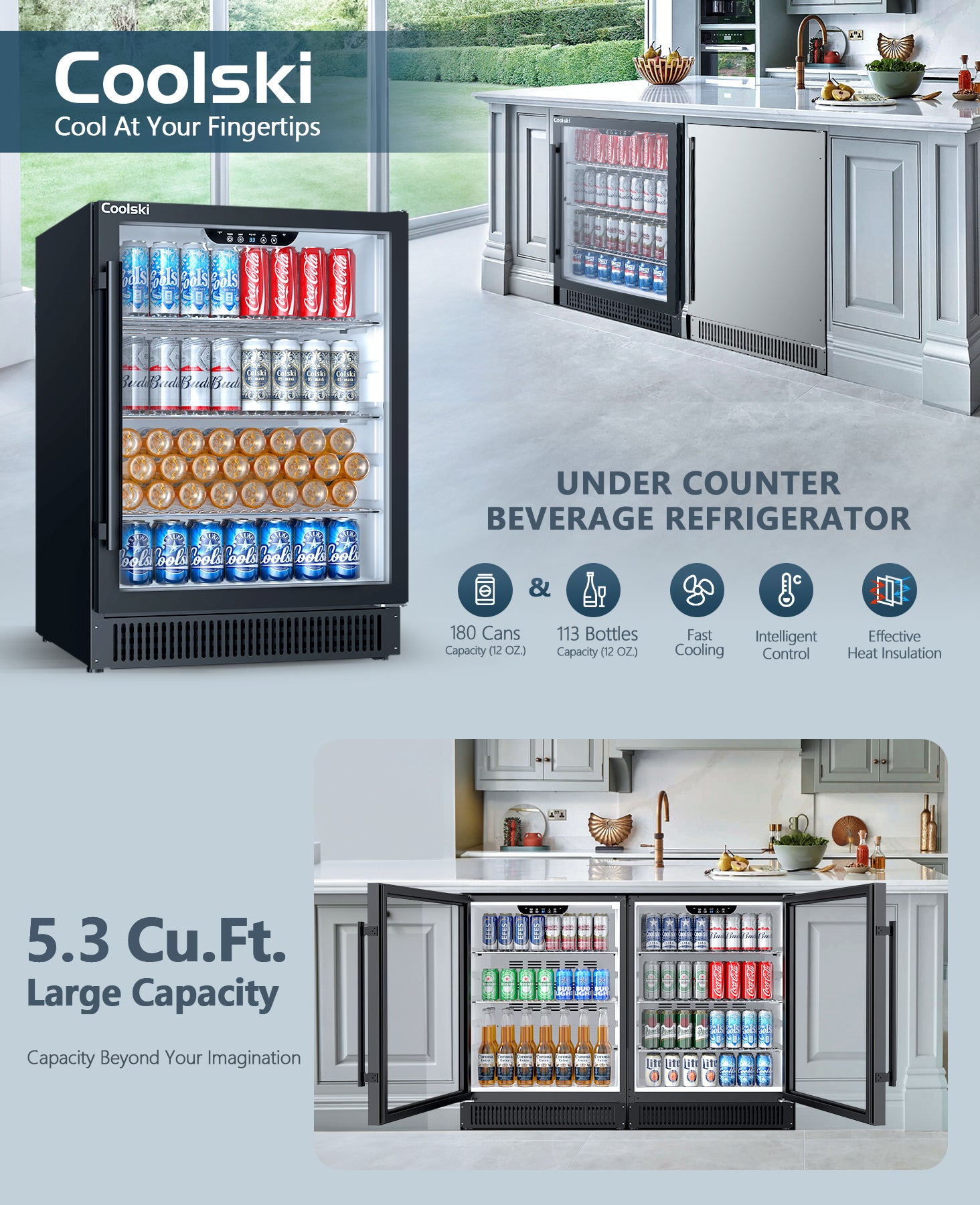 Coolski 24” 180 Cans(12 Oz.) Under Counter Built-In / Freestanding Beverage Refrigerator with Glass Door