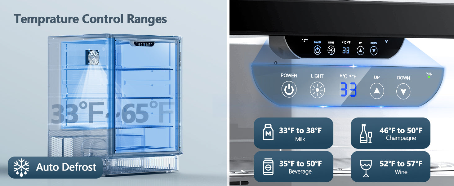 【Fast Air Cooling System】The powerful compressor allows the refrigerator to reach a cooling temperature range of 33℉ - 65℉. The classic LED digital button controller can quickly and accurately adjust and show the temperature, and the circulating air cooling system provides the best cooling temperature effect, to make your favorite beverages in the best state.