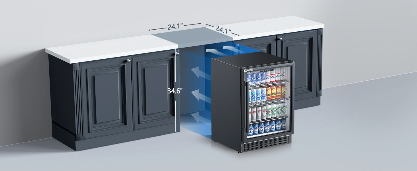 【Built-In Under Counter or Freestanding】The drink fridge adopts a front ventilation design, when the built-in under counter, it can achieve a good heat dissipation effect without wasting too much space on the side or back, and the compact size will save a lot of space in your home, bar, or kitchen. The install cutout dimension is 24''W × 24''D × 34.5''H, leaving enough cutout space for quick installation.