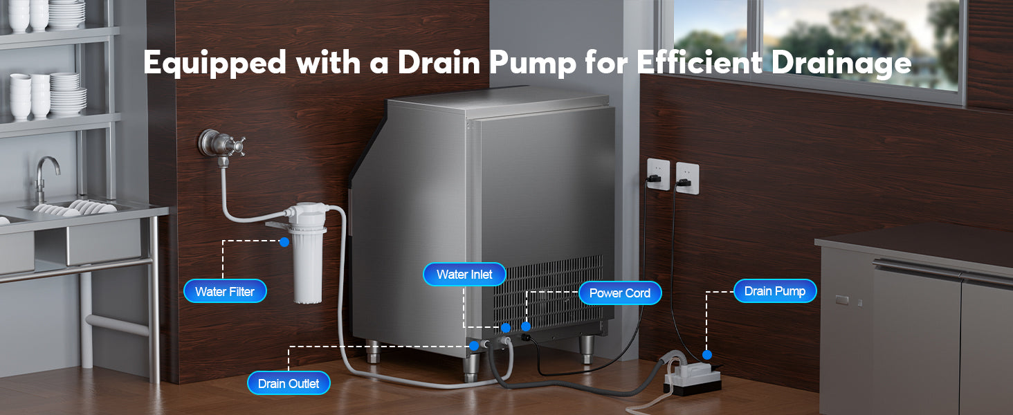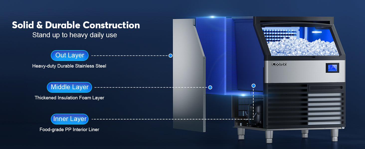 [Automatic Cleaning Function] Our commercial ice machine is designed to provide maximum convenience with its self-cleaning function that automatically cleans all the ice trays-just press the button! It eliminates the hassle of manual cleaning, ensures a steady stream of clean ice cubes day after day and provides long-term convenience.