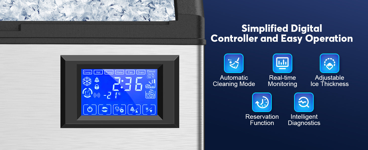 [Easy-to-use Digital Controller] This commercial ice maker features a built-in diagnostic system that easily identifies issues to ensure optimal performance. With its intuitive digital controller, you can easily the ice making process in real time, and adjust ice cube thickness, and make reservations.
