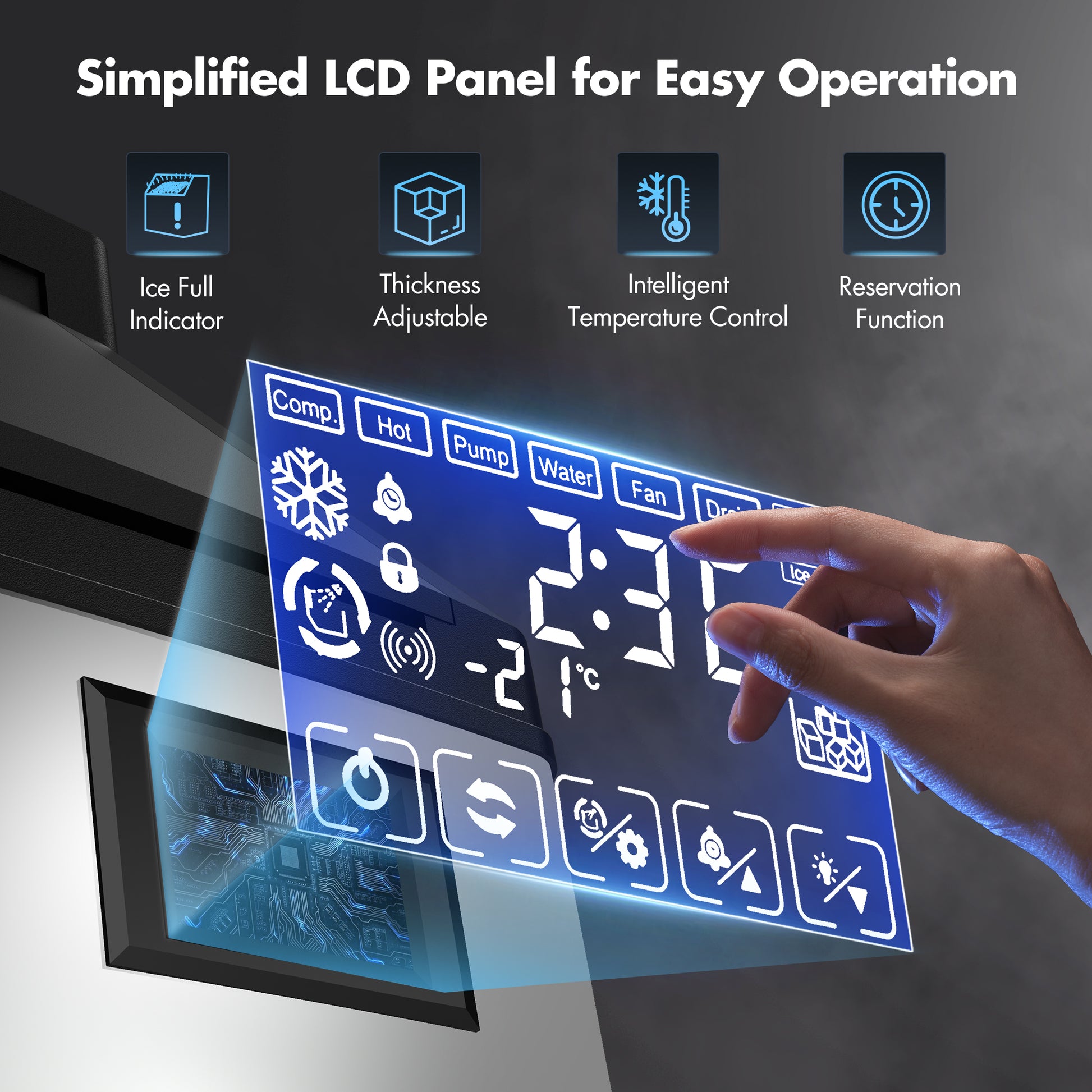 - Adjust the thickness of the ice cubes directly through the control panel to meet versatile drinks' needs.
