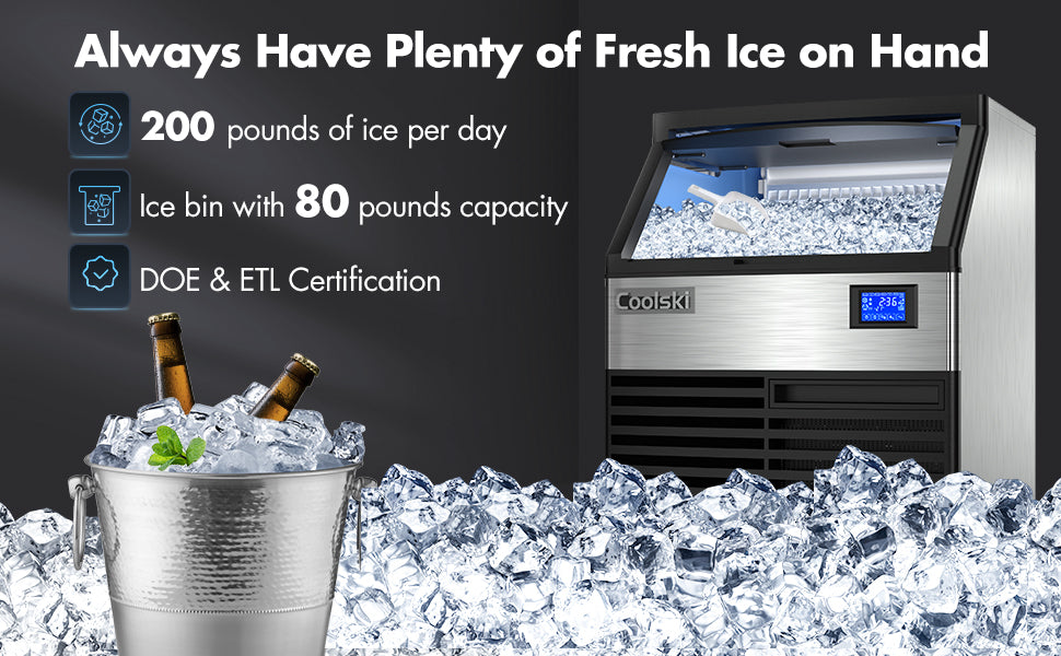[High Production Rate] This commercial ice machine produces 200 pounds of clear ice cubes per day and equips with an ice bin of 80-pound storage capacity. Great for meeting the high demands of busy bars, cafes, restaurants, etc. A powerful and efficient compressor with eco-friendly refrigerant R290 makes ice quickly while saving energy.