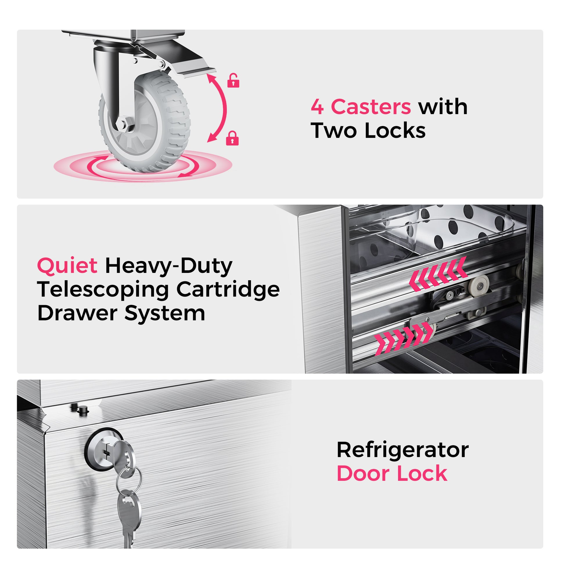 - Stainless Steel Construction: Made of high quality stainless steel inside and out, undercounter industrial fridge with drawers resists rust, corrosion and daily wear. The smooth surface wipes clean quickly with a damp cloth after spills, and the stainless steel interior prevents odors from lingering to keep stored items fresh.
