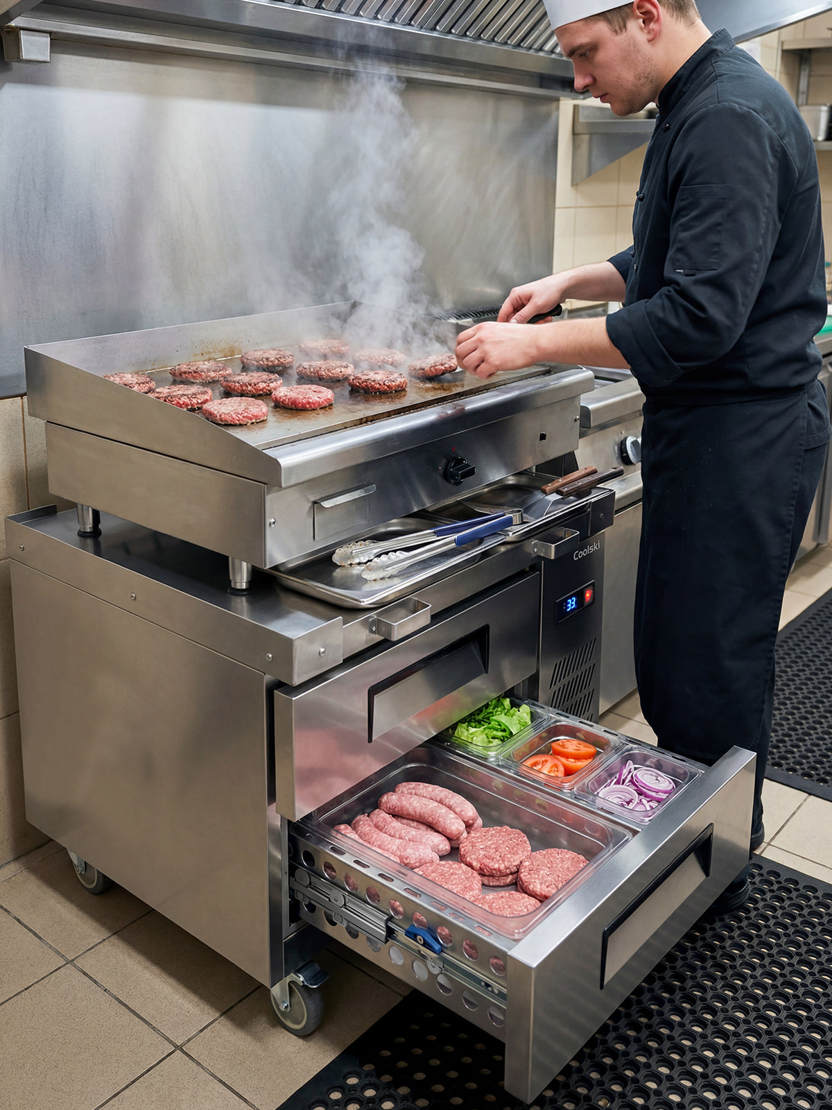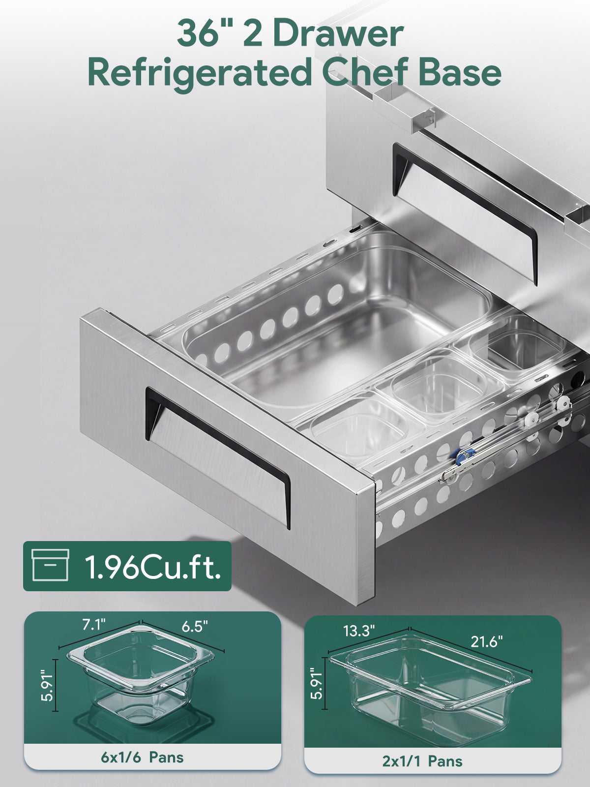 - Double Drawer Design: Coolski commercial chef base refrigerator offers 1.96 Cu.ft. of storage space, paired with 2 drawers and 8 pans. Measuring 35.6"W x 33.1"D x 26.8"H, it fits perfectly in restaurants, bars, diners and commercial kitchens without occupying excessive space, maximizing storage efficiency for ingredients and prep tools.
