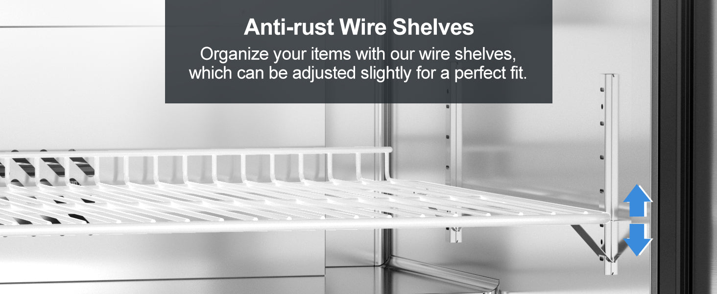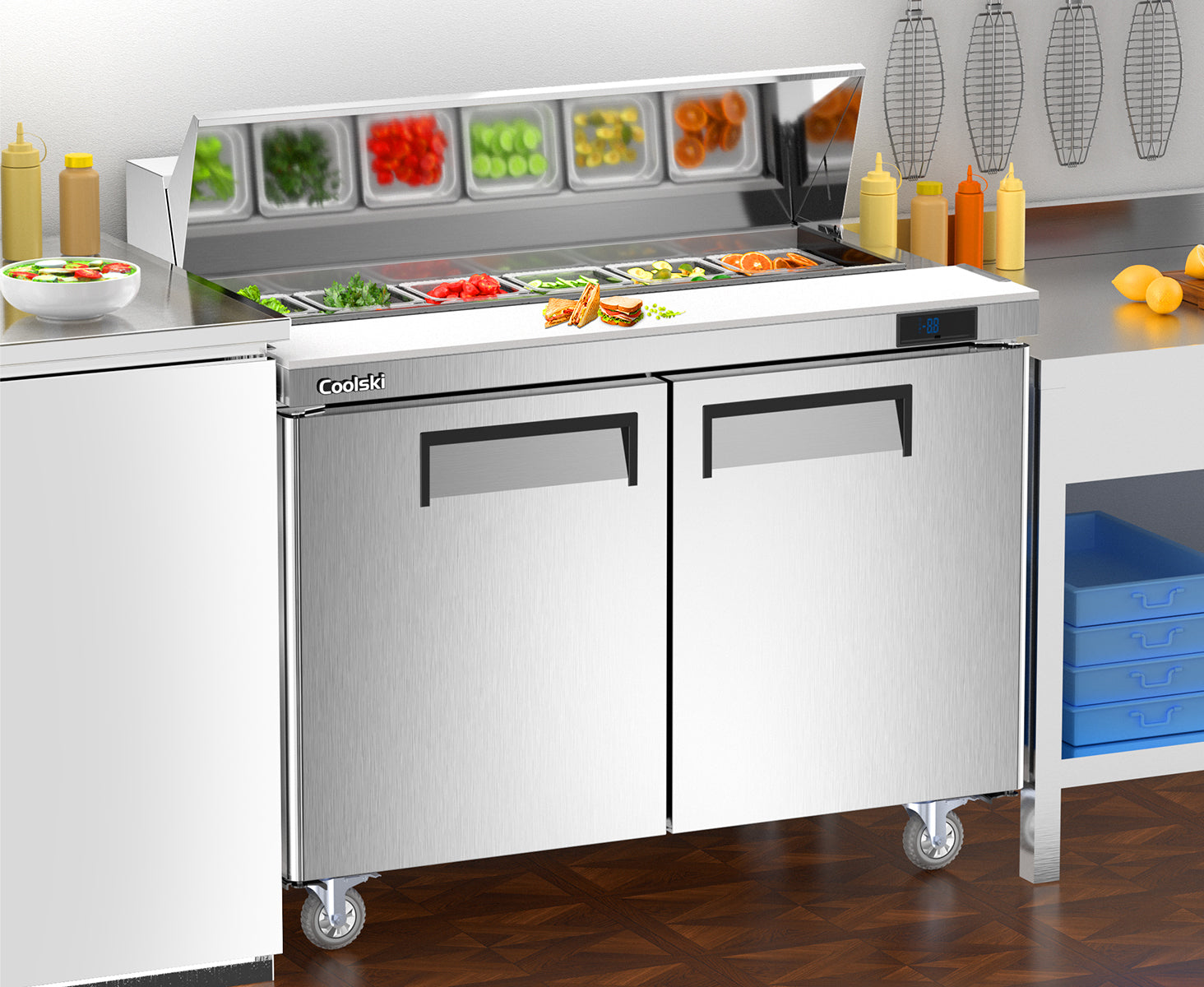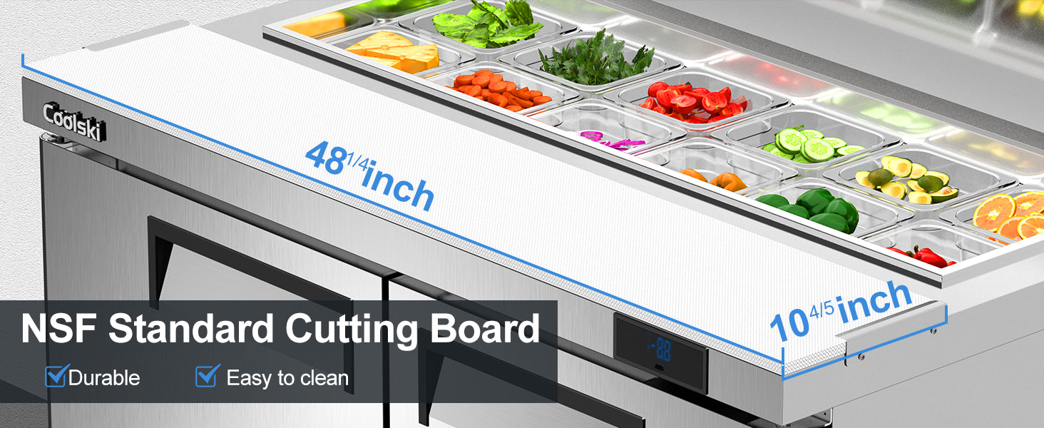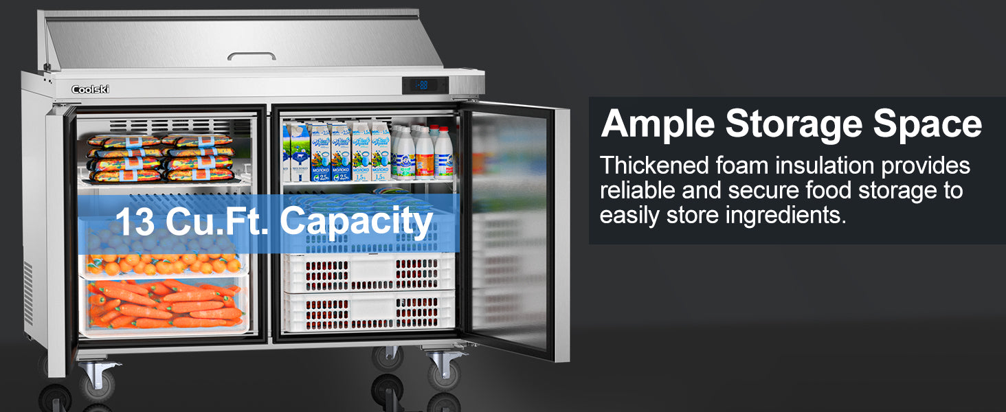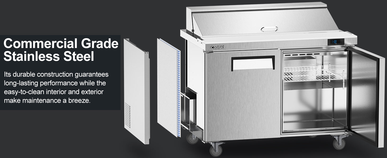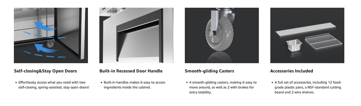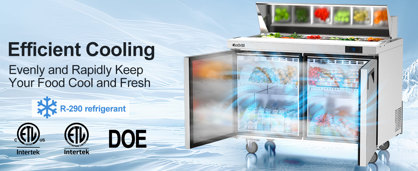 [Excellent Cooling Performance] With a powerful compressor, R-290 refrigerant and an innovative air distribution system, our prep refrigerator deliver fast, efficient, even cooling performance, while preserving optimum freshness and safety with NSF-7 temperatures even when ambient temperatures are high. Plus, it is equipped with an automatic defrost function to ensure optimal moisture management.