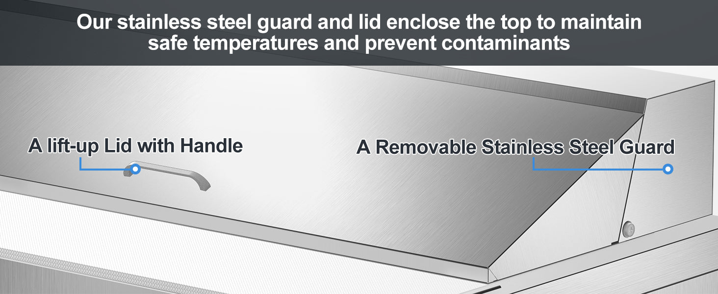 [Fully Functional Refrigerator] Our refrigerated sandwich prep table features a lift-up lid encloses the top to ensure your food stays at the right temperature and safe from contamination. It also has a removable stainless steel guard, which makes cleaning more convenient and thorough. Beneath the worktop is additional storage cabinets with 2 self-closing & stay-open doors and 2 adjustable anti-rust shelves.