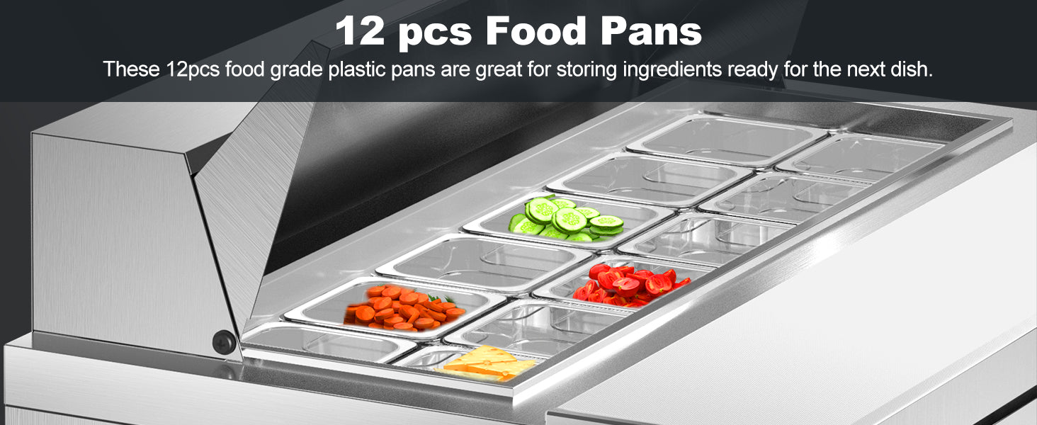 [Buy with Confidence] We offer a full set of accessories, including 12 food-grade plastic pans and a cutting board. Our refrigerated salad prep table is an ideal choice for restaurants, cafeteria, sub shop and large families that often gathers, maximizing efficiency and speeding up food prep for burgers, sandwiches, salads, etc. We provide 5-year warranty for compressor and 2-year warranty for parts.