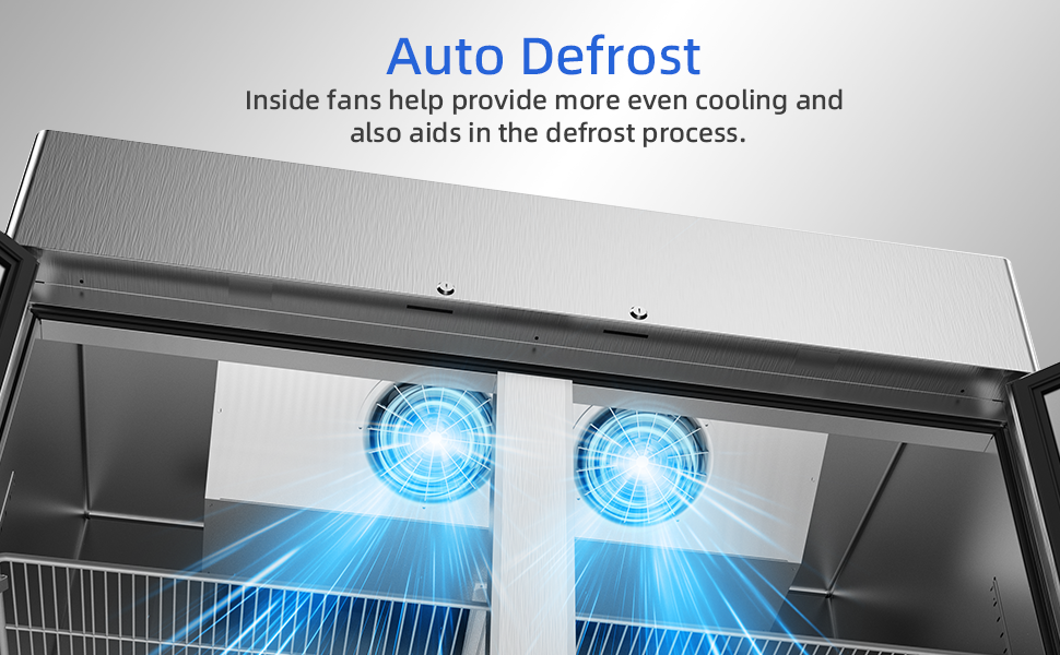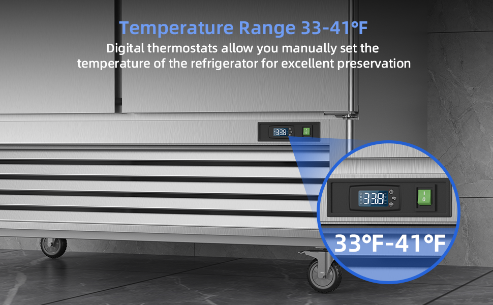 [Excellent Refrigeration Performance] Powered by an energy-efficient compressor and R290 refrigerant, this commercial fridge delivers rapid, consistent cooling while maintaining an optimal temperature range of 33°F to 41°F. The auto-defrost function prevents ice buildup, ensuring efficient operation. Through digital thermostat, you can easily control the temperature within the 33–41°F range.