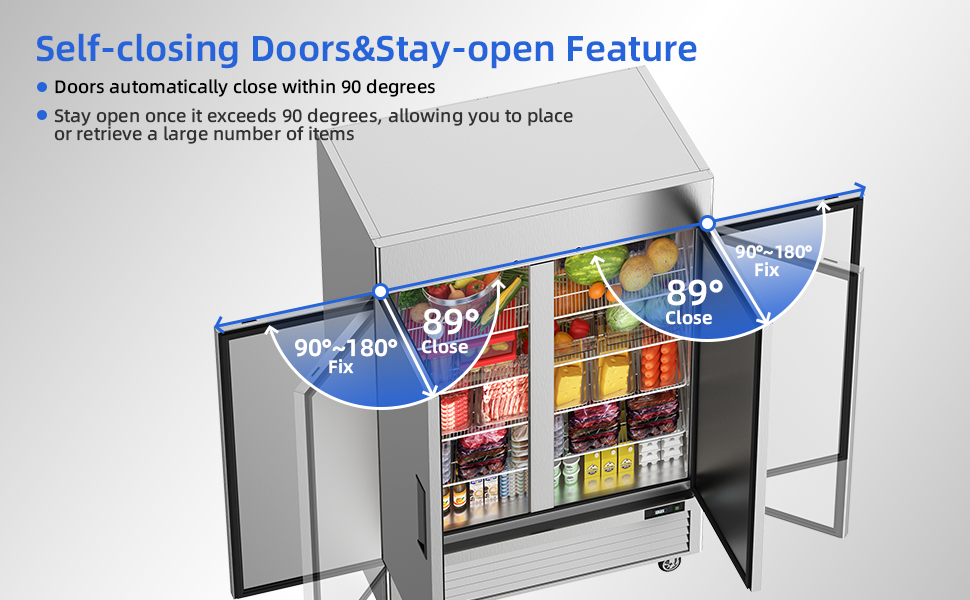 [Energy Efficient Refrigerator] This DOE-certified commercial refrigerator can reduce energy consumption by up to 40% compared to conventional models, significantly lowering your operational costs over time. Featuring self-closing mechanism with stay-open function, these stainless steel doors prevent accidental heat loss while allowing easy access during bulk loading.