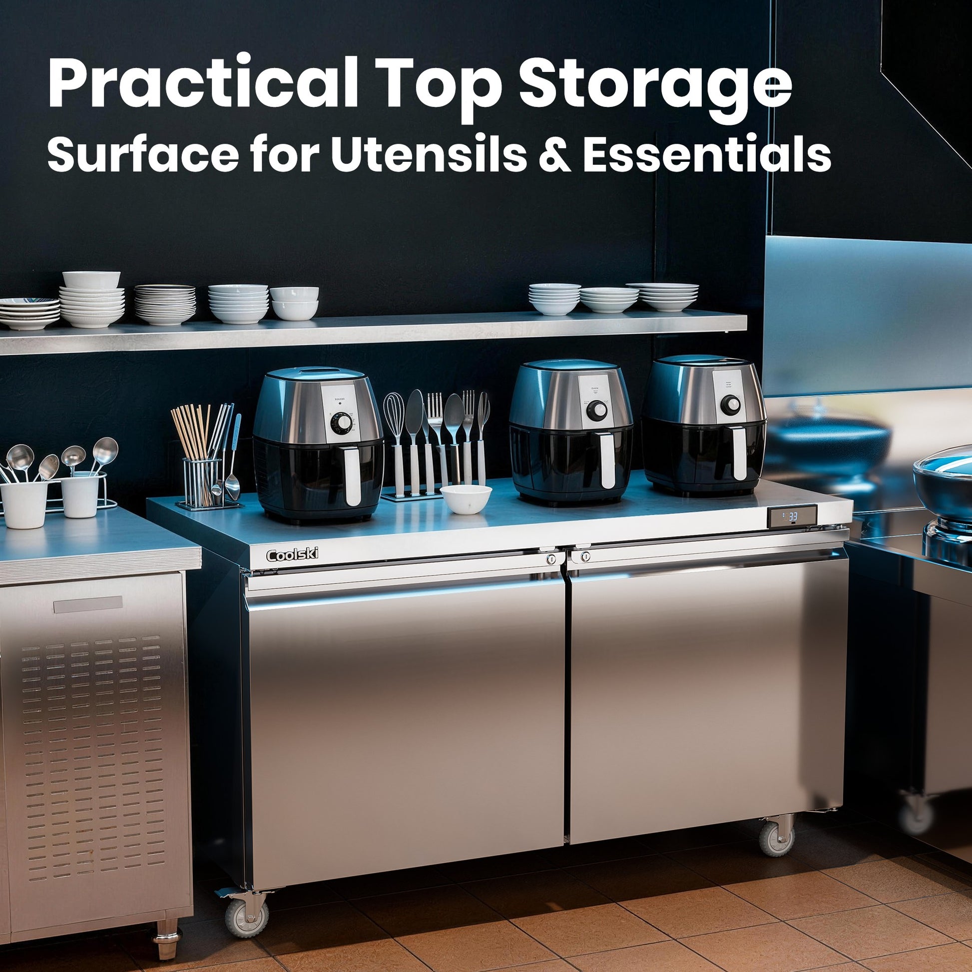 - 17.6 Cu.ft. of Interior Storage: Coolski's commercial worktop undercounter refrigerator offers 17.6 Cu.ft. of storage space, paired with a removable wire shelf that creates four separate storage layers. The adjustable shelf lets you customize the space to fit items of different heights, maximizing storage efficiency without taking up extra floor space.
