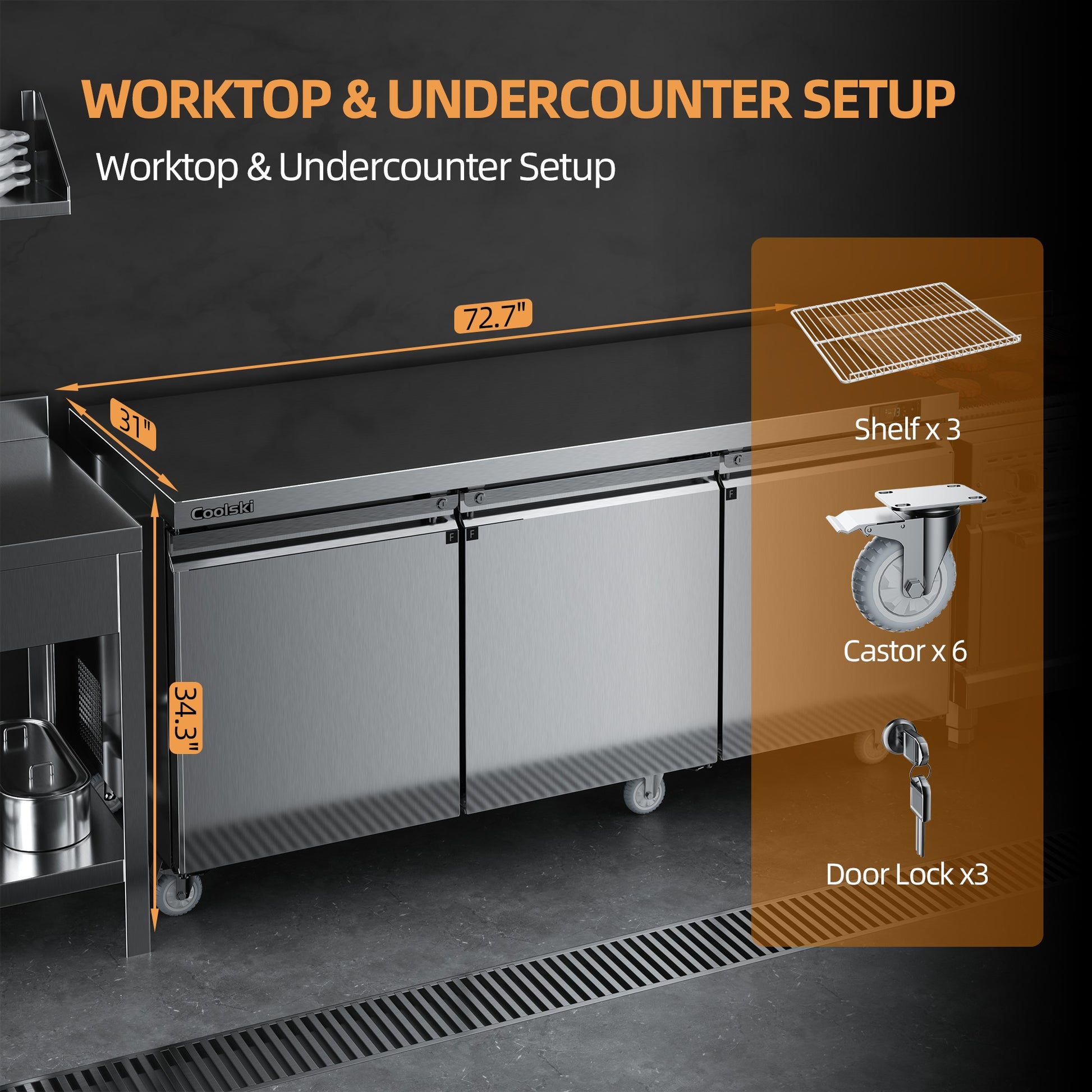 - Practical Worktop Design: Measuring 72.7”W x 31”D x 34.3”H with a 15.65 Sq.Ft usable surface, undercounter fridge doubles as a certified ETL Sanitation prep table. The spacious worktop is ideal for food prep or storing kitchen tools, blending compliance and functionality for commercial settings.