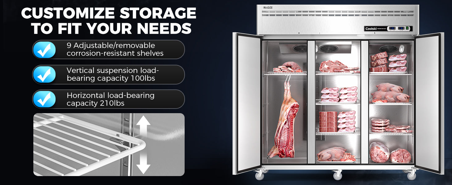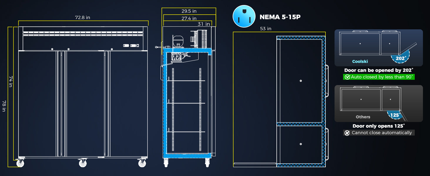 - Dual Temp Control and Lagre Capacity: With its spacious 72-inch width and dual-temperature feature, this refrigerator/freezer provides ample storage space and versatile temperature control for all your food storage needs. The adjustable shelves on the inside of the unit make organizing and storing food ingredients and supplies easy.