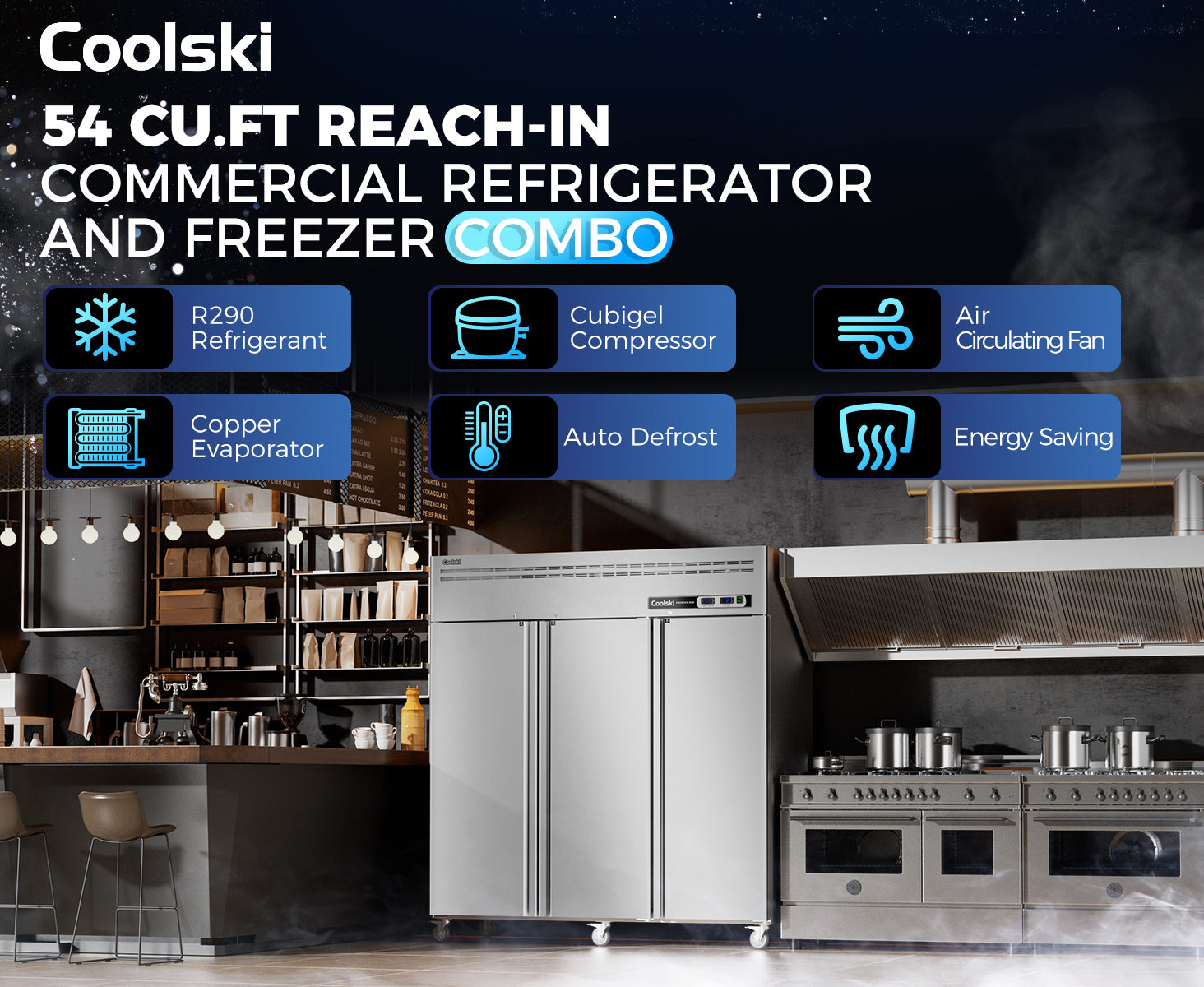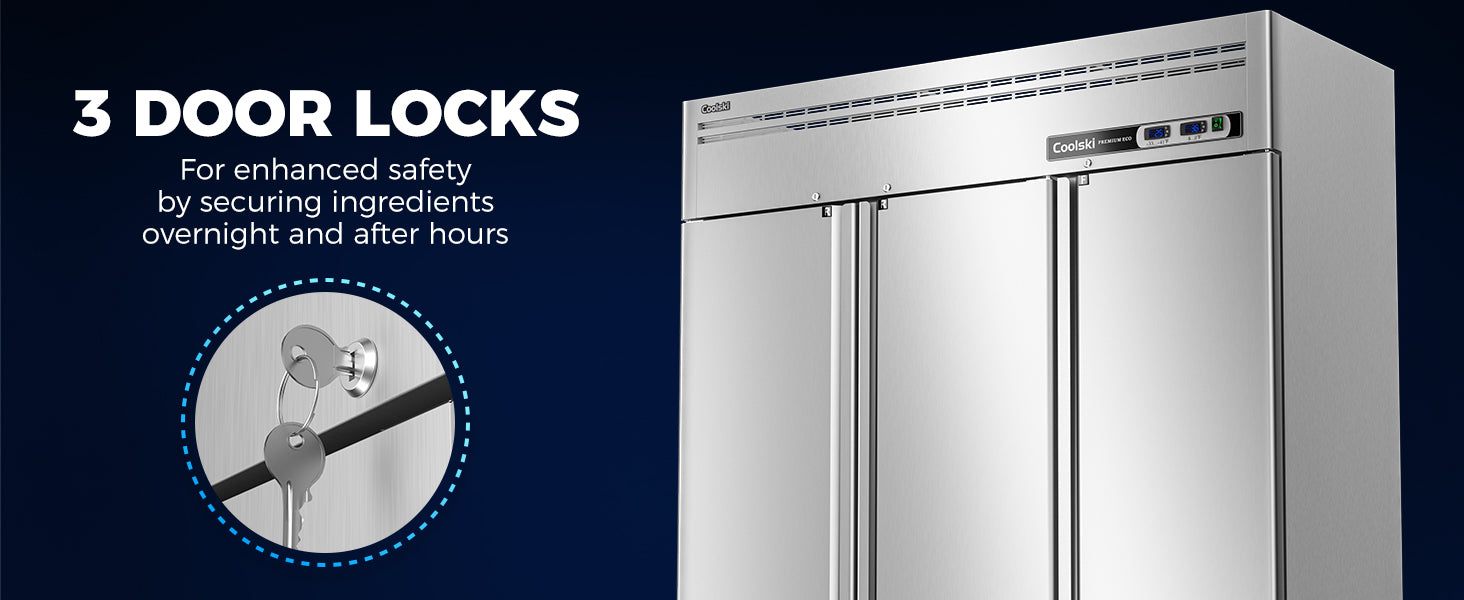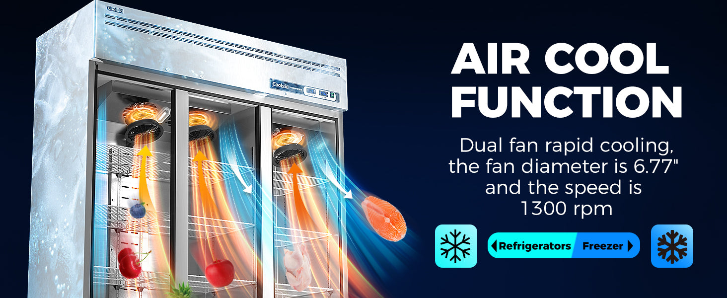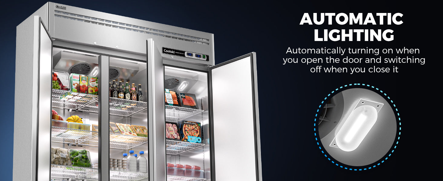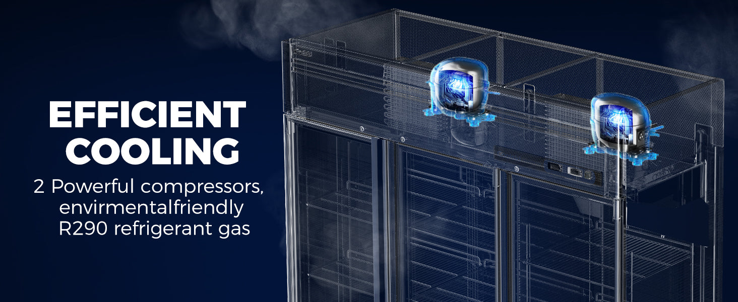 - Efficient Air Cooling System: The refrigerator utilizes energy efficiency R290 Hydrocarbon refrigerant, helping you save on electricity bills. Cubigel compressor and copper evaporator work together to ensure fast even cooling and optimal temperature levels throughout your reach-in commercial refrigerator, while the auto defrost design prevents frost or ice buildup. The innovative heating of the freezer door frame prevents water mist buildup.