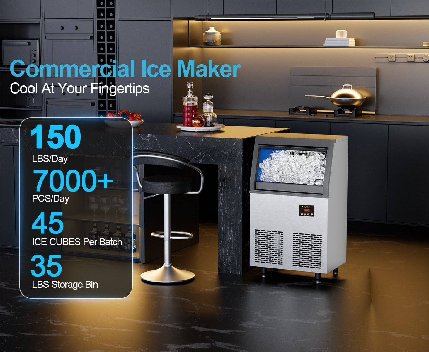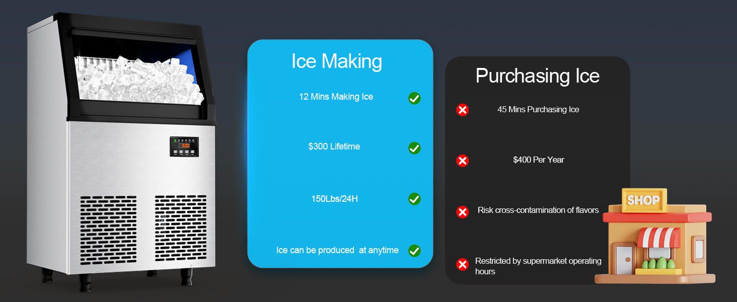 High Efficiency with 150LBS/24H Output:This commercial ice maker churns out 150 pounds of clear ice cubes daily and has a thickened ice bin with 35 pounds storage capacity, reducing ice melting rate during 5 - 7 hours of storage and minimizing losses.