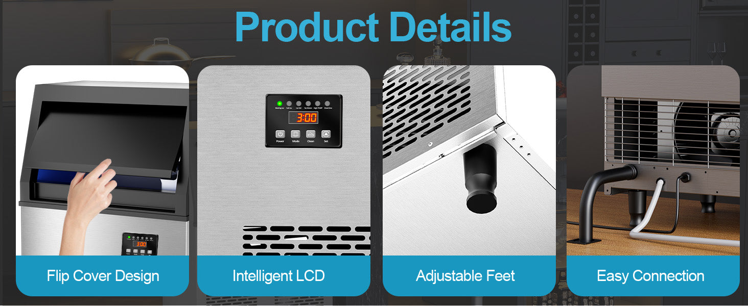 Easy Operation:Use the "Set" button to adjust ice production time and cube thickness, and the self-cleaning function is just one click away. The built-in diagnostic system shows problems on the LCD digital control panel for quick troubleshooting.