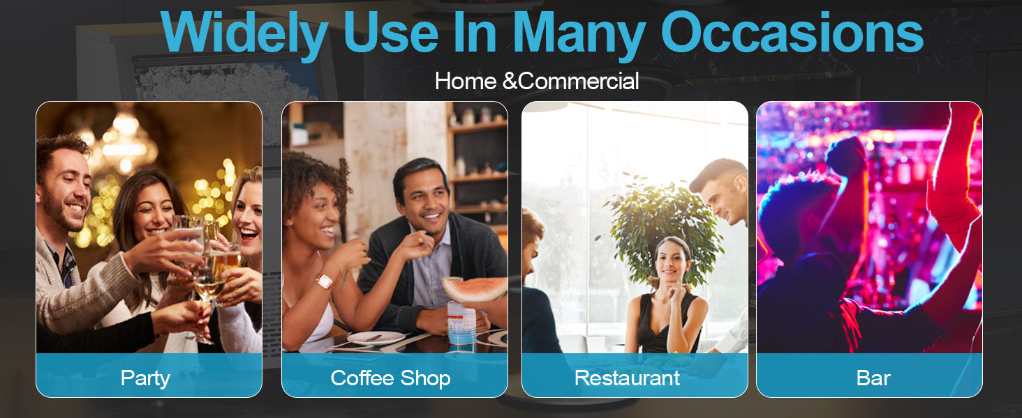 Commercial&Household: Measuring only 20''W × 15''D × 33''H, ice maker commercial can be placed under the counter or in various places like home, bar, restaurant, offices, etc. The ice cube size is adjustable.