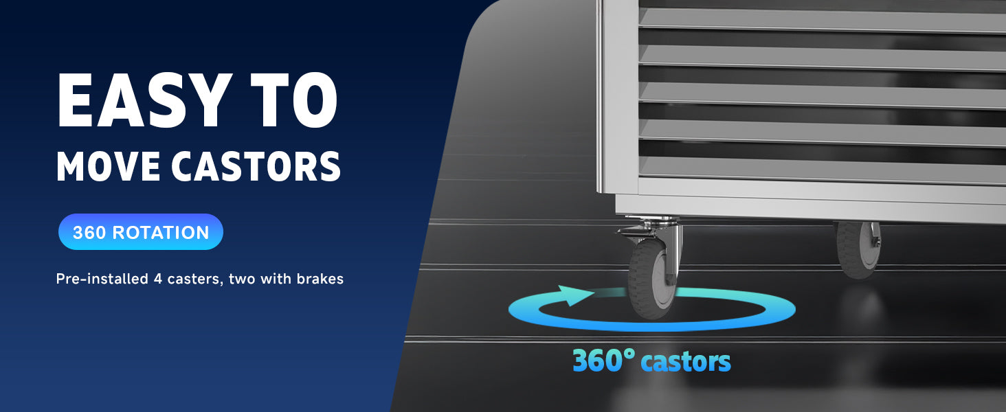 - User-Friendly Features: Enjoy features such as self-closing doors that stay open at 180 degrees for easy access, and a secure door lock for enhanced food safety. Additionally, four bottom casters allow for effortless mobility, facilitating cleaning and maintenance, while LED lighting enhances visibility during nighttime use.