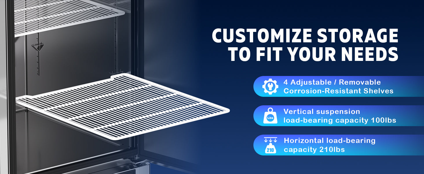 - Stainless Steel Build & Adjustable Shelves: This commercial freezer is built to last, with polyurethane foam insulation to keep temperatures stable inside the unit.Both the exterior and interior are made from long-lasting stainless steel, which is easy to clean and maintain, while 4 adjustable shelves can hold up to 210 lbs each, providing ample space for all your food storage needs.