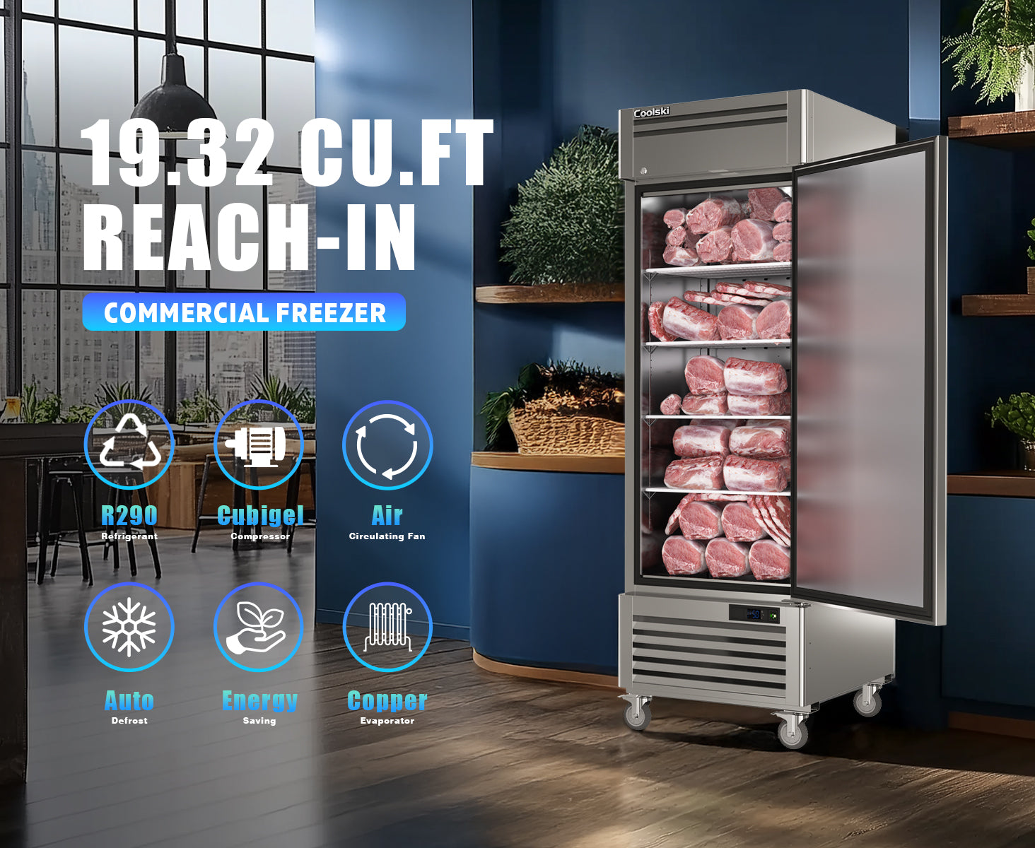 Coolski 27" W Commercial Freezer, 19.32 Cu.ft Single Solid Door Stainless Steel Reach-in Freezer
